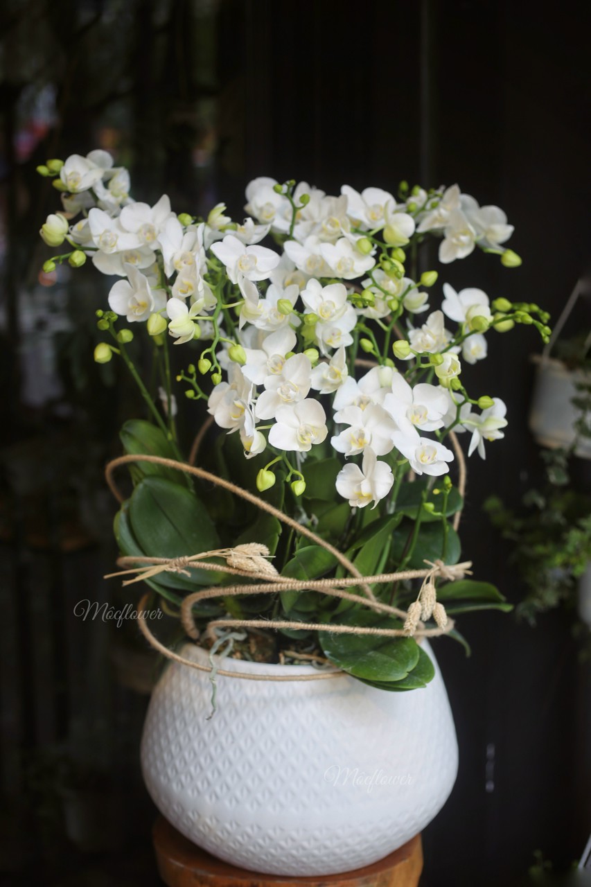 Chậu lan hồ điệp trắng được các nhà thiết kế của Hoa Lan Phương ghép thành chậu hoa lan sang trọng và tinh tế. Chậu lan hồ điệp trắng thánh thiện là một món quà tặng chúc mừng không thể tuyệt vời hơn để dành tặng cho những người thân yêu hoặc đối tác khách hàng vào những dịp quan trọng chắc chắn sẽ làm mối quan hệ ngày càng phát triển và vững bền hơn bao giờ hết.